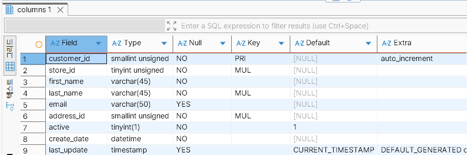 SHOW COLUMNS FROM customer 문장의 실행 결과는 다음과 같다. customer 테이블은 9개의 열로 구성되어 있고 customer_id 열이 기본 키로 지정되어 있음을 확인할 수 있다.