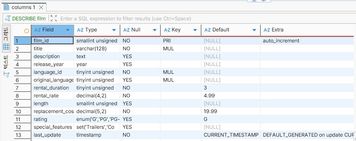 DESCRIBE film; 문장의 실행 결과는 다음과 같다. SHOW COLUMNS FROM ... 문과 동일한 결과를 낸다. film 테이블은 13개의 열로 구성되어 있고 film_id 열이 기본 키로 지정되어 있음을 알 수 있다.