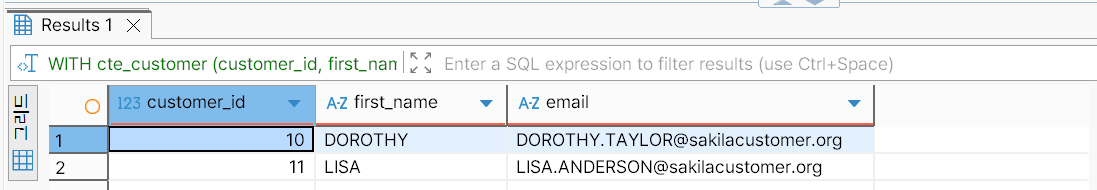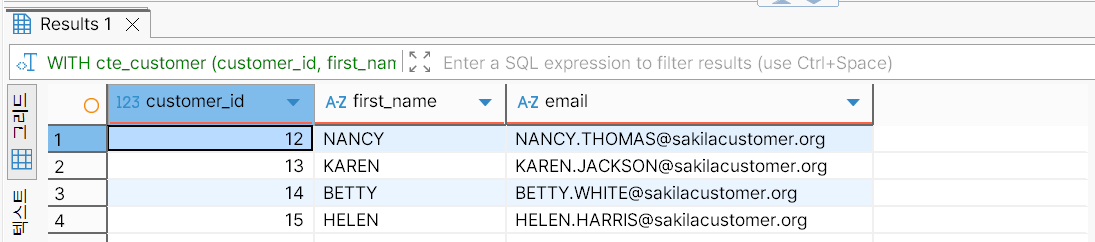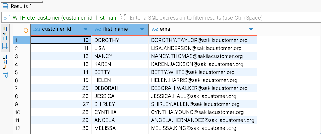 cte_customer;6번째 행과 7번째 행을 경계로 두 SELECT 문의 조회 결과가 결합되었다.