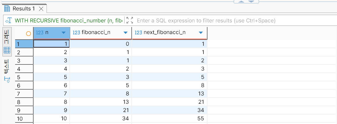WHERE 절의 n < 20 조건을 n < 10으로 바꾼 뒤 실행한 결과는 다음과 같다. 반복이 10회 감소함에 따라 행의 개수도 10개 감소했다.