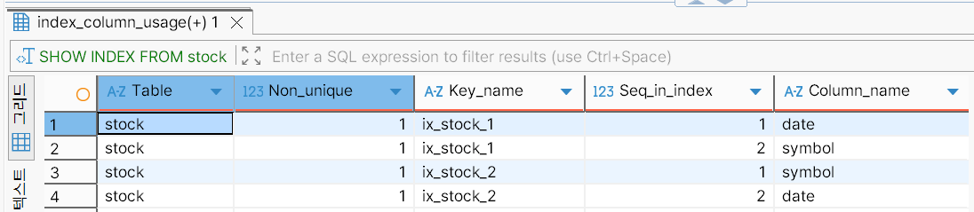 stock 테이블에 인덱스가 생성되었는지 확인한다.