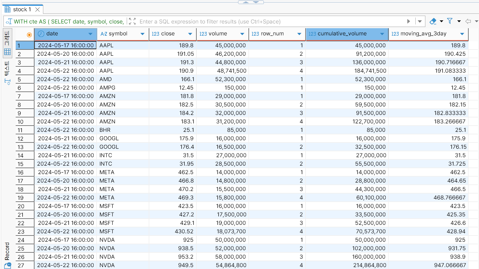 row_num열: 종목별 날짜 순서대로 정렬한 뒤 순번을 부여한다.cumulative_volume열: 종목별 날짜 순서대로 정렬한 뒤 거래량의 누적 합계를 계산한다.moving_avg_3day열: 종목별 날짜 순서대로 정렬한 뒤 3일 이동 평균을 계산한다.